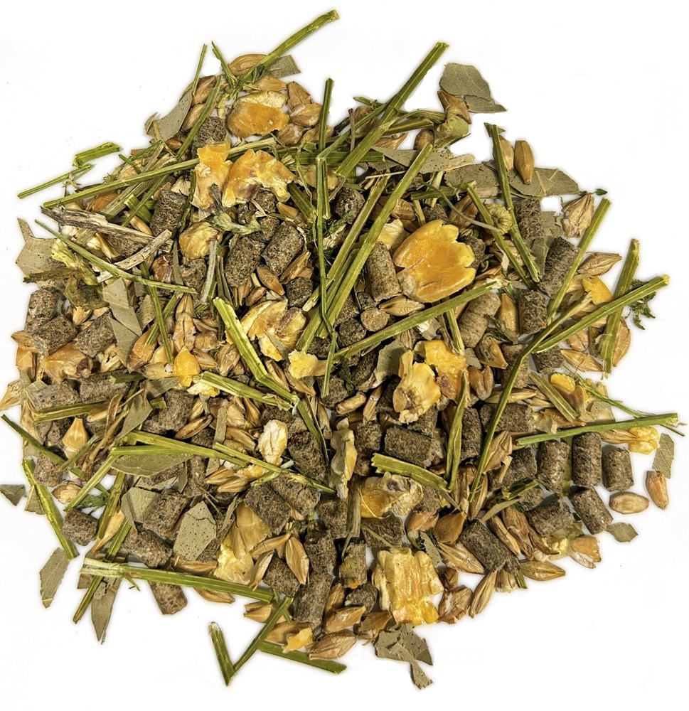 Состав: хлопья ячменя, хлопья кукурузы, пшеничные отруби, яблочный жом сушеный, свекловичная патока, свекловичный жом мелассированный, люцерна сушеная, смесь трав (крапива, эвкалипт, кориандр, семена фенхеля, алтей лекарственный, тимьян, ромашка аптечная, семена пажитника, листья березы, анис, еловая хвоя, подорожник ланцетолистный, тмин, шалфей, можжевельник, чеснок сушеный), шелуха семян подсолнечника, семена льна, карбонат кальция, пивные дрожжи.