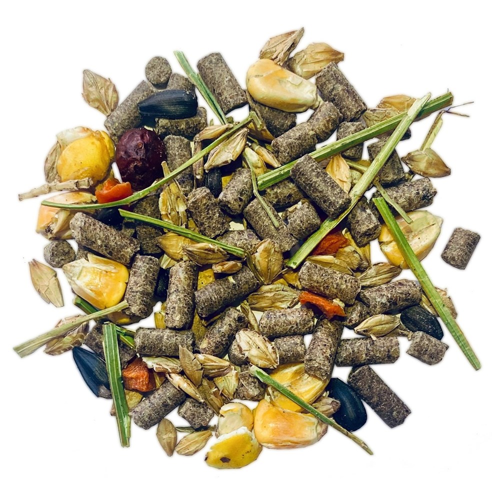 Состав: хлопья ячменя, хлопья кукурузы, пшеничные отруби, яблочный жом, масло подсолнечное, свекловичный жом, семена подсолнечника, свекловичная патока, пшеничная мучка, смесь сушеных многолетних трав, карбонат кальция, сечка люцерны,морковь, облепиховый жом, пивные дрожжи, мука из морских водорослей, семена расторопши, корень одуванчика, цветы и листья боярышника, плоды боярышника хлорид натрия, монокальций фосфат, оксид магния.